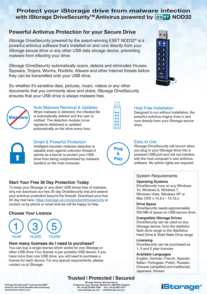 iStorage DriveSecurity הוא תוכנת אנטי-וירוס עוצמתית הפועלת ישירות מכונן ה-USB המוצפן של iStorage או מכל התקן אחסון USB אחר.