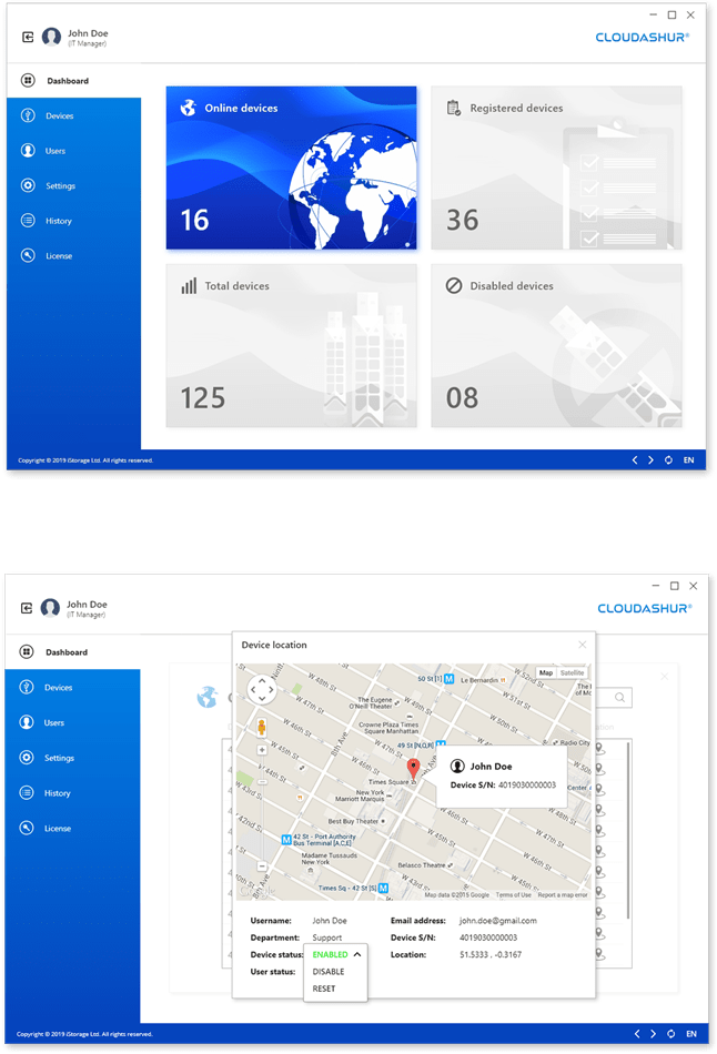 ![]() | cloudAshur ניהול מרחוק מעניק לך שליטה מלאה בכל מודולי אבטחת החומרה של cloudAshur הפרוסים בארגון שלך ומציעים מגוון רחב של תכונות לניהול כל המשתמשים. תכונות עיקריות מסוף הניהול המרוחק של iStorage מספק למנהל מערכת נראות ושליטה מלאה על הדברים הבאים: השבת או איפוס באופן זמני (הרוג מרחוק) משתמשים במודולי cloudAshur - במקרה של פעילות חשודה או שעובד עוזב את הארגון מבלי להחזיר את מודול ההצפנה של cloudAshur שלהם. הגבל את סוגי הקבצים - שלוט בסוגי הקבצים שמועלים ומשתפים בענן (EXE, PNG, PDF וכו '...) צפה בקבצי יומן המשתמש - ראות מלאה על כל מה שעושה כל משתמש בענן, למשל, אילו קבצים הם נמצאים העלאה, הורדה, שינוי וכו '... הצגת מיקום המשתמש - באפשרותך להציג את המיקום של מודולי ה- cloudAshur של המשתמש באמצעות מפה על גבי המסך. גידור גידור וגידור זמן - הגבלת הזמן והמיקום של היכן ומתי ניתן להשתמש במודול ההצפנה של cloudAshur על ידי כל משתמש בודד. מסוף הניהול המרוחק של iStorage תואם ל- Windows (Vista / 7/8/10). |