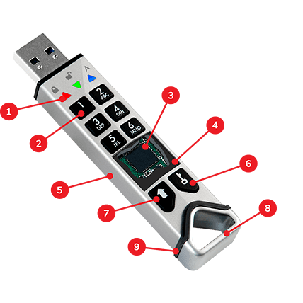1. נורות LED אדום - מצב המתנה ירוק - מצב משתמש כחול - מצב מנהל 2. לוח מקשים מצופה פולימר, עמיד בפני שחיקה, אלפנומרי 3. קריטריונים נפוצים EAL4 + מעבד מיקרו מאובטח מוכן 4. ציפוי אפוקסי 5. מעטה אלומיניום קשיח מחודד ומחוספס 6. לחצן מקש 7. לחצן SHIFT 8. סגסוגת אבץ (ניתן לחיבור למפתח) 9. אטם גומי הפיכת המודול לנגד מים בעת שרוול | ![]() |